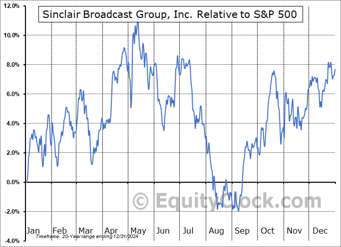 Analysis of the Sinclair Broadcast Group, Inc. (NASD:SBGI) seasonal charts above shows that a Buy Date of October 28 and a Sell Date of January 19 has resulted in a geometric average return of 9.39% above the benchmark rate of the S&P 500 Total Return Index over the past 20 years. This seasonal timeframe has shown positive results compared to the benchmark in 15 of those periods. This is a good rate of success and the return strongly outperforms the relative buy-and-hold performance of the stock over the past 20 years by an average of 11.6% per year.