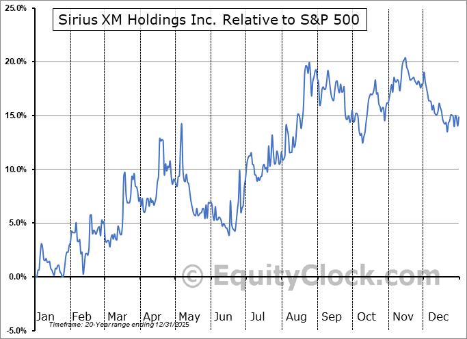 Analysis of the Sirius XM Holdings Inc. (NASD:SIRI) seasonal charts above shows that a Buy Date of May 9 and a Sell Date of August 1 has resulted in a geometric average return of 1.29% above the benchmark rate of the S&P 500 Total Return Index over the past 20 years. This seasonal timeframe has shown positive results compared to the benchmark in 15 of those periods. This is a good rate of success and the return strongly outperforms the relative buy-and-hold performance of the stock over the past 20 years by an average of 15.27% per year.