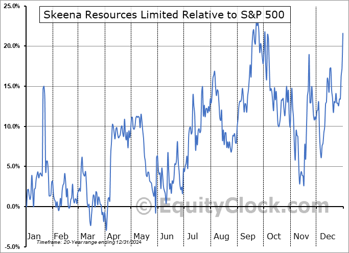 Analysis of the Skeena Resources Limited (TSE:SKE.TO) seasonal charts above shows that a Buy Date of November 30 and a Sell Date of March 4 has resulted in a geometric average return of 10.03% above the benchmark rate of the S&P 500 Total Return Index over the past 20 years. This seasonal timeframe has shown positive results compared to the benchmark in 16 of those periods. This is a very good rate of success and the return strongly outperforms the relative buy-and-hold performance of the stock over the past 20 years by an average of 28.92% per year.
