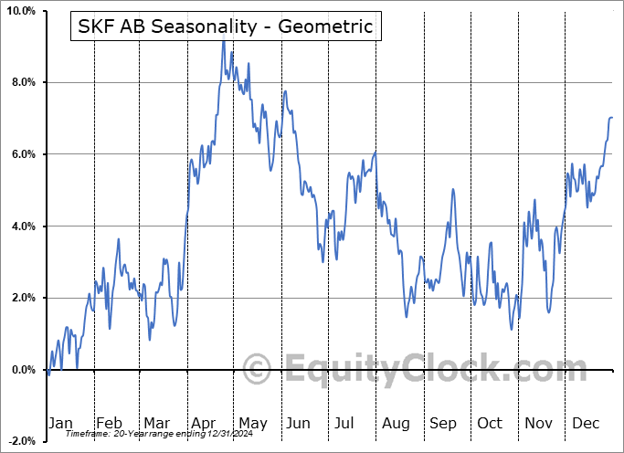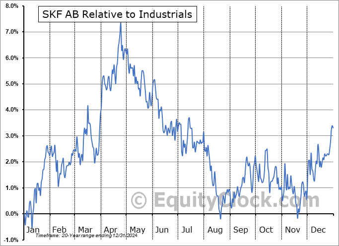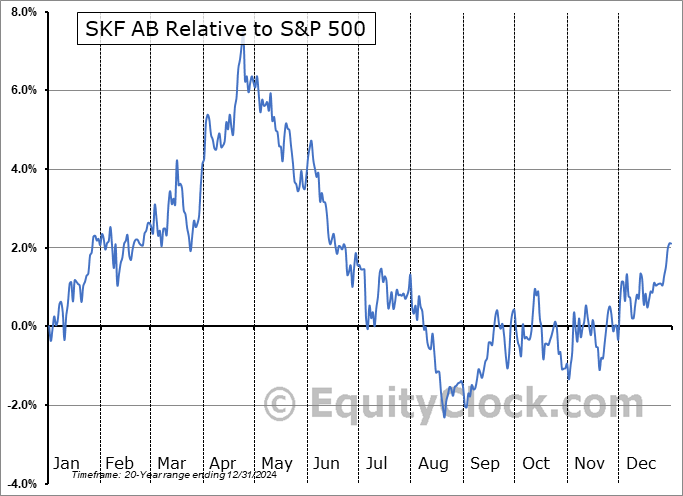 Analysis of the SKF AB (OTCMKT:SKFRY) seasonal charts above shows that a Buy Date of January 2 and a Sell Date of April 21 has resulted in a geometric average return of 5.14% above the benchmark rate of the S&P 500 Total Return Index over the past 20 years. This seasonal timeframe has shown positive results compared to the benchmark in 16 of those periods. This is a very good rate of success and the return strongly outperforms the relative buy-and-hold performance of the stock over the past 20 years by an average of 8.07% per year.