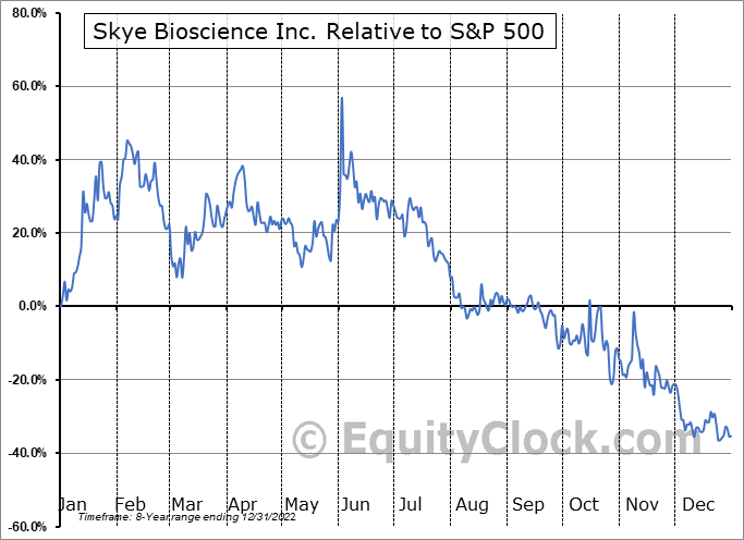 Analysis of the Skye Bioscience Inc. (OTCMKT:SKYE) seasonal charts above shows that a Buy Date of March 10 and a Sell Date of June 8 has resulted in a geometric average return of 11.64% above the benchmark rate of the S&P 500 Total Return Index over the past 8 years. This seasonal timeframe has shown positive results compared to the benchmark in 5 of those periods. This is a fair rate of success and the return strongly outperforms the relative buy-and-hold performance of the stock over the past 8 years by an average of 111.64% per year.