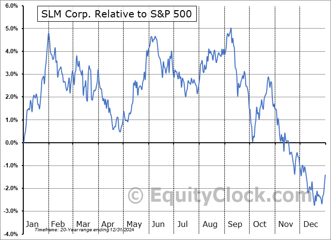 Analysis of the SLM Corp. (NASD:JSM) seasonal charts above shows that a Buy Date of December 10 and a Sell Date of March 7 has resulted in a geometric average return of 3.61% above the benchmark rate of the S&P 500 Total Return Index over the past 20 years. This seasonal timeframe has shown positive results compared to the benchmark in 16 of those periods. This is a very good rate of success and the return strongly outperforms the relative buy-and-hold performance of the stock over the past 20 years by an average of 8.87% per year.