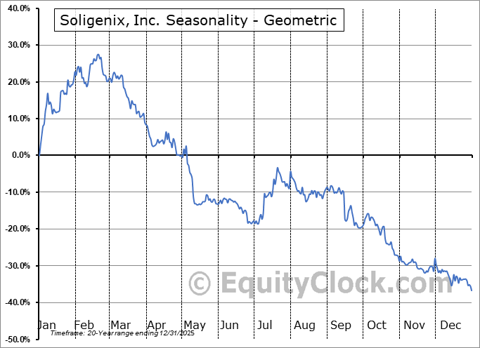 Analysis of the Soligenix, Inc. (NASD:SNGX) seasonal charts above shows that a Buy Date of December 17 and a Sell Date of March 7 has resulted in a geometric average return of 15.28% above the benchmark rate of the S&P 500 Total Return Index over the past 20 years. This seasonal timeframe has shown positive results compared to the benchmark in 15 of those periods. This is a good rate of success and the return strongly outperforms the relative buy-and-hold performance of the stock over the past 20 years by an average of 115.28% per year.