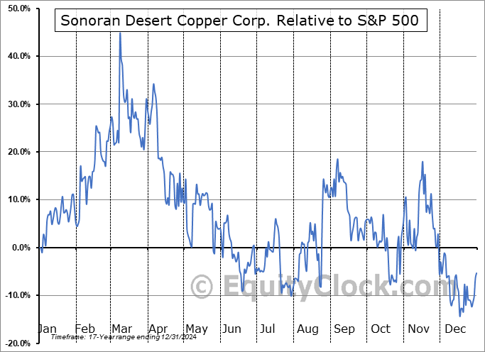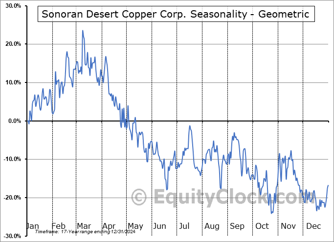 Analysis of the Sonoran Desert Copper Corp. (TSXV:SDCU.V) seasonal charts above shows that a Buy Date of December 2 and a Sell Date of March 25 has resulted in a geometric average return of 11.47% above the benchmark rate of the S&P 500 Total Return Index over the past 17 years. This seasonal timeframe has shown positive results compared to the benchmark in 12 of those periods. This is a good rate of success and the return strongly outperforms the relative buy-and-hold performance of the stock over the past 17 years by an average of 36.36% per year.