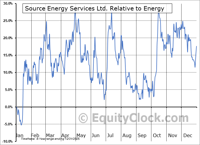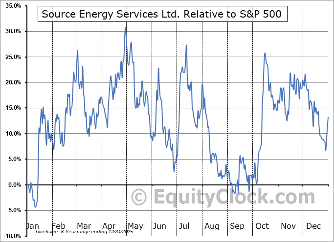 Analysis of the Source Energy Services Ltd. (TSE:SHLE.TO) seasonal charts above shows that a Buy Date of December 2 and a Sell Date of February 21 has resulted in a geometric average return of 21.81% above the benchmark rate of the S&P 500 Total Return Index over the past 7 years. This seasonal timeframe has shown positive results compared to the benchmark in 6 of those periods. This is a very good rate of success and the return strongly outperforms the relative buy-and-hold performance of the stock over the past 7 years by an average of 54.86% per year.