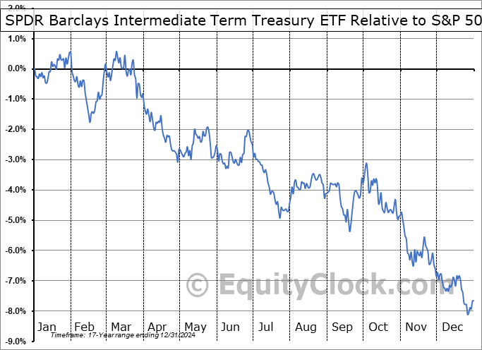 Analysis of the SPDR Barclays Intermediate Term Treasury ETF (NYSE:SPTI) seasonal charts above shows that a Buy Date of July 23 and a Sell Date of October 12 has resulted in a geometric average return of 2.02% above the benchmark rate of the S&P 500 Total Return Index over the past 17 years. This seasonal timeframe has shown positive results compared to the benchmark in 9 of those periods. This is a poor rate of success and the return strongly outperforms the relative buy-and-hold performance of the stock over the past 17 years by an average of 10.06% per year.