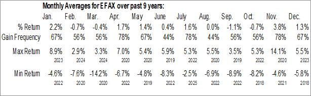 A word of caution: Only 7 years of data is available for shares of EFAX, perhaps insufficient to create a seasonal profile that accurately gauges the seasonal tendencies influencing the investment. Ideally, while 20 years is preferred, at least 10 years of data is required to perform a seasonal analysis that is considered to be reliable for future seasonal periods.
