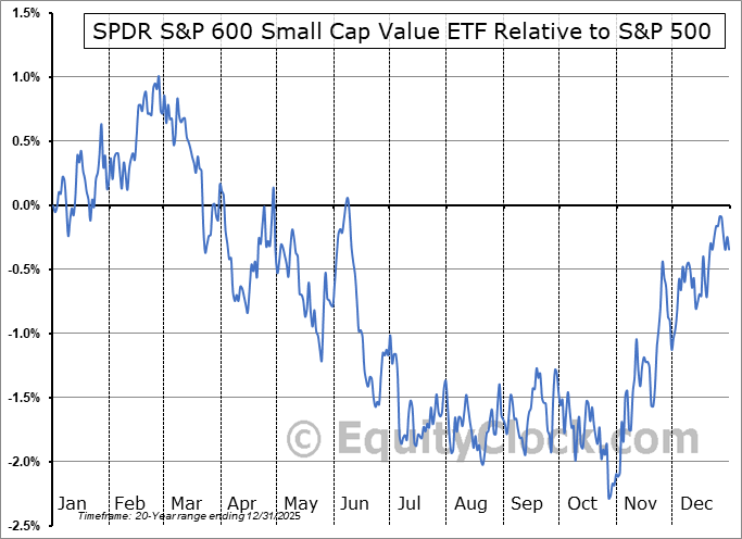 Analysis of the SPDR S&P 600 Small Cap Value ETF (NYSE:SLYV) seasonal charts above shows that a Buy Date of October 27 and a Sell Date of March 4 has resulted in a geometric average return of 1.56% above the benchmark rate of the S&P 500 Total Return Index over the past 20 years. This seasonal timeframe has shown positive results compared to the benchmark in 14 of those periods. This is a good rate of success and the return strongly outperforms the relative buy-and-hold performance of the stock over the past 20 years by an average of 3.13% per year.