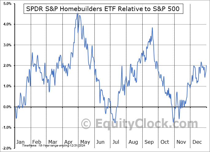 Analysis of the SPDR S&P Homebuilders ETF (NYSE:XHB) seasonal charts above shows that a Buy Date of November 9 and a Sell Date of January 28 has resulted in a geometric average return of 4.36% above the benchmark rate of the S&P 500 Total Return Index over the past 18 years. This seasonal timeframe has shown positive results compared to the benchmark in 15 of those periods. This is a very good rate of success and the return strongly outperforms the relative buy-and-hold performance of the stock over the past 18 years by an average of 7.32% per year.
