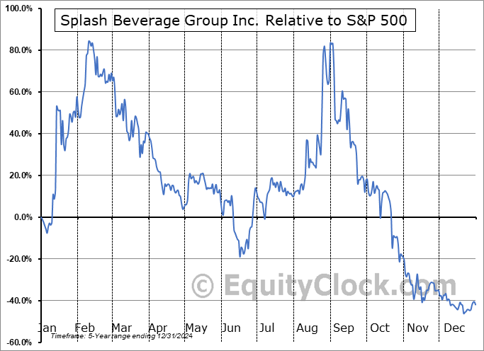 Analysis of the Splash Beverage Group Inc. (AMEX:SBEV) seasonal charts above shows that a Buy Date of December 12 and a Sell Date of March 1 has resulted in a geometric average return of 59.8% above the benchmark rate of the S&P 500 Total Return Index over the past 5 years. This seasonal timeframe has shown positive results compared to the benchmark in 5 of those periods. This is an excellent rate of success and the return strongly outperforms the relative buy-and-hold performance of the stock over the past 5 years by an average of 109.38% per year.