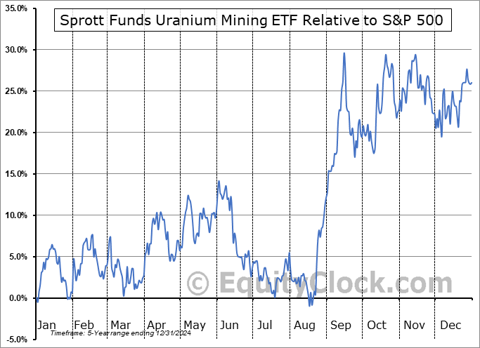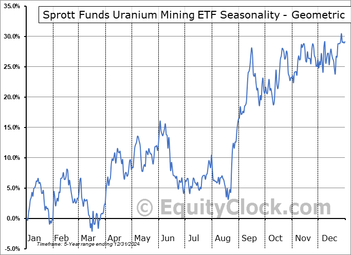 Analysis of the Sprott Funds Uranium Mining ETF (AMEX:URNM) seasonal charts above shows that a Buy Date of August 17 and a Sell Date of January 13 has resulted in a geometric average return of 34.89% above the benchmark rate of the S&P 500 Total Return Index over the past 4 years. This seasonal timeframe has shown positive results compared to the benchmark in 4 of those periods. This is an excellent rate of success and the return strongly outperforms the relative buy-and-hold performance of the stock over the past 4 years by an average of 18.79% per year.