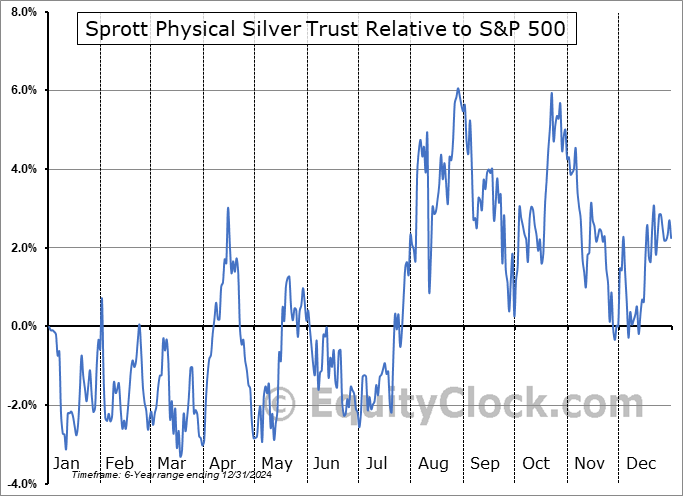 Analysis of the Sprott Physical Silver Trust (TSE:PSLV.TO) seasonal charts above shows that a Buy Date of November 30 and a Sell Date of April 21 has resulted in a geometric average return of 6.31% above the benchmark rate of the S&P 500 Total Return Index over the past 6 years. This seasonal timeframe has shown positive results compared to the benchmark in 6 of those periods. This is an excellent rate of success and the return strongly outperforms the relative buy-and-hold performance of the stock over the past 6 years by an average of 12.45% per year.