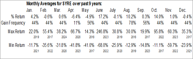 A word of caution: Only 8 years of data is available for shares of SYRE, perhaps insufficient to create a seasonal profile that accurately gauges the seasonal tendencies influencing the investment. Ideally, while 20 years is preferred, at least 10 years of data is required to perform a seasonal analysis that is considered to be reliable for future seasonal periods.