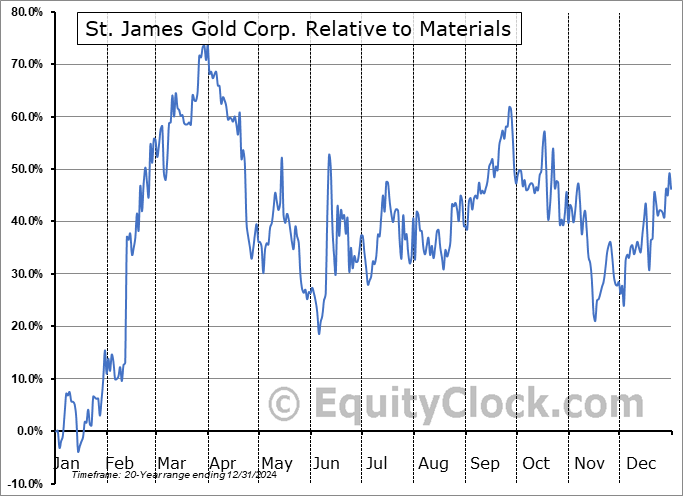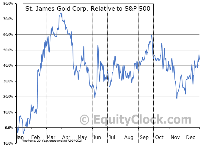 Analysis of the St. James Gold Corp. (TSXV:LORD.V) seasonal charts above shows that a Buy Date of December 3 and a Sell Date of February 21 has resulted in a geometric average return of 41.85% above the benchmark rate of the S&P 500 Total Return Index over the past 20 years. This seasonal timeframe has shown positive results compared to the benchmark in 16 of those periods. This is a very good rate of success and the return strongly outperforms the relative buy-and-hold performance of the stock over the past 20 years by an average of 51.25% per year.