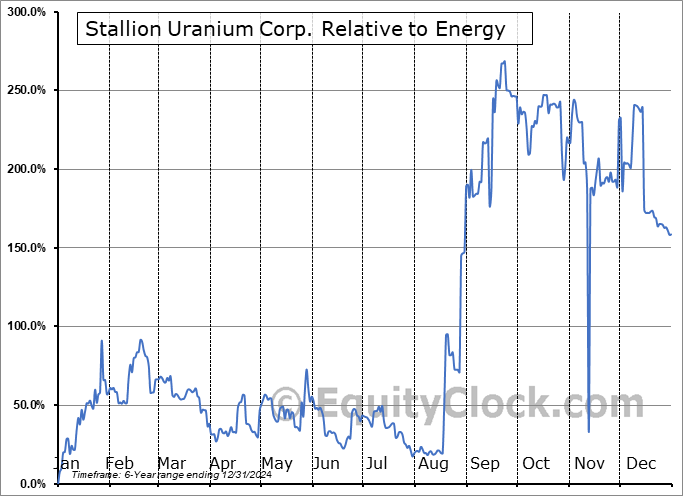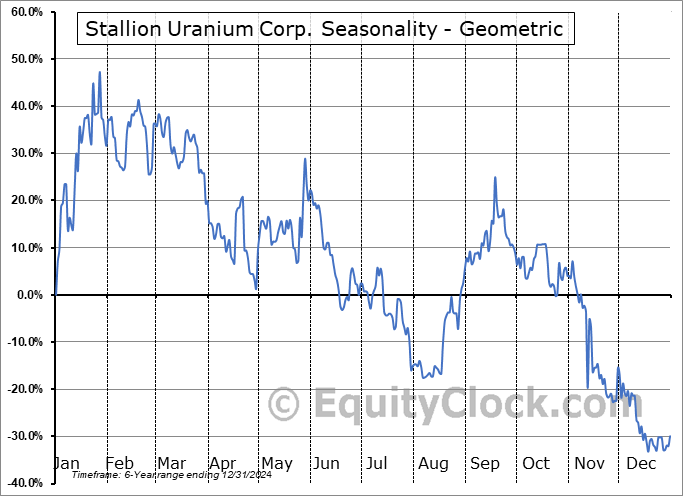 Analysis of the Stallion Uranium Corp. (TSXV:STUD.V) seasonal charts above shows that a Buy Date of December 15 and a Sell Date of March 19 has resulted in a geometric average return of 44.59% above the benchmark rate of the S&P 500 Total Return Index over the past 6 years. This seasonal timeframe has shown positive results compared to the benchmark in 4 of those periods. This is a good rate of success and the return strongly outperforms the relative buy-and-hold performance of the stock over the past 6 years by an average of 85.04% per year.