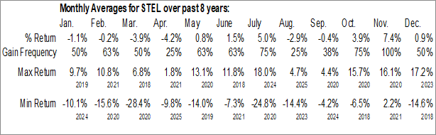 A word of caution: Only 7 years of data is available for shares of STEL, perhaps insufficient to create a seasonal profile that accurately gauges the seasonal tendencies influencing the investment. Ideally, while 20 years is preferred, at least 10 years of data is required to perform a seasonal analysis that is considered to be reliable for future seasonal periods.