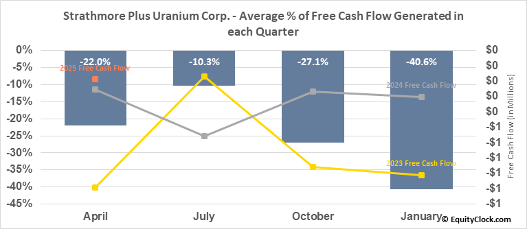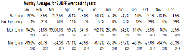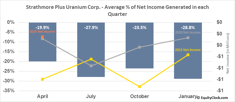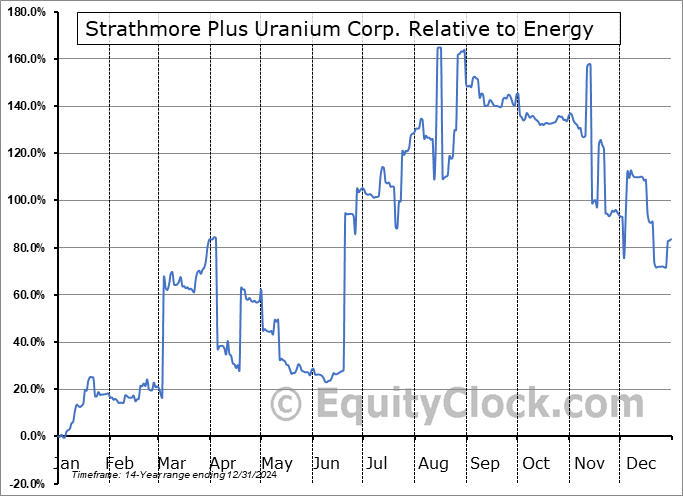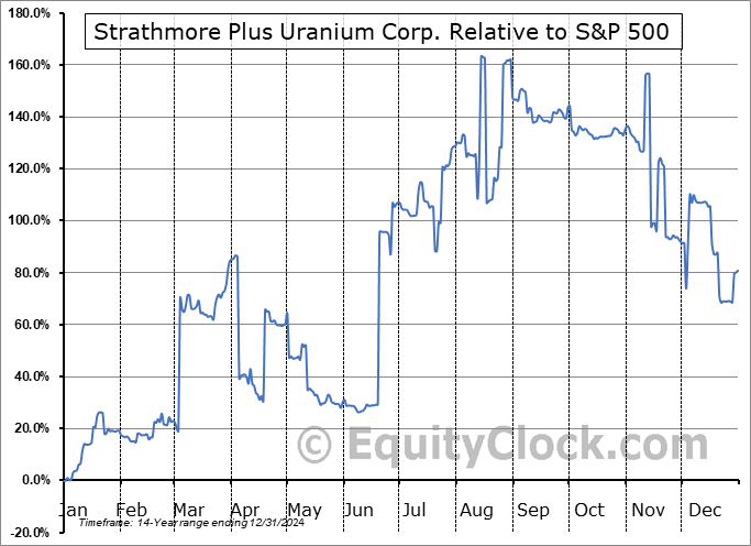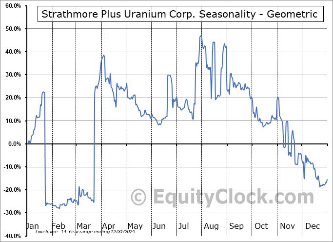 Analysis of the Strathmore Plus Uranium Corp. (OTCMKT:SUUFF) seasonal charts above shows that a Buy Date of December 29 and a Sell Date of April 3 has resulted in a geometric average return of 35.83% above the benchmark rate of the S&P 500 Total Return Index over the past 14 years. This seasonal timeframe has shown positive results compared to the benchmark in 10 of those periods. This is a good rate of success and the return strongly outperforms the relative buy-and-hold performance of the stock over the past 14 years by an average of 61.47% per year.