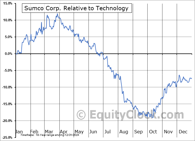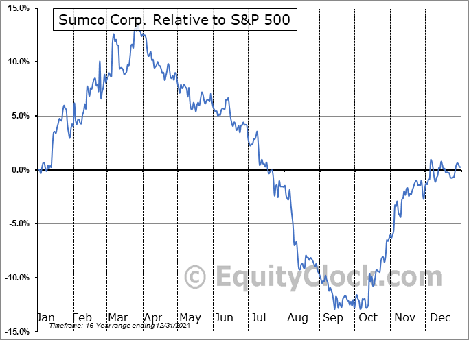 Analysis of the Sumco Corp. (OTCMKT:SUOPY) seasonal charts above shows that a Buy Date of November 1 and a Sell Date of March 7 has resulted in a geometric average return of 9.95% above the benchmark rate of the S&P 500 Total Return Index over the past 15 years. This seasonal timeframe has shown positive results compared to the benchmark in 12 of those periods. This is a very good rate of success and the return strongly outperforms the relative buy-and-hold performance of the stock over the past 15 years by an average of 24.75% per year.