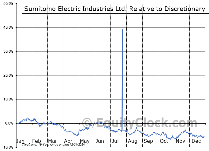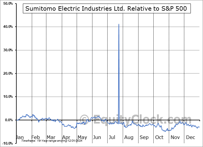Analysis of the Sumitomo Electric Industries Ltd. (OTCMKT:SMTOY) seasonal charts above shows that a Buy Date of October 30 and a Sell Date of January 22 has resulted in a geometric average return of 3.73% above the benchmark rate of the S&P 500 Total Return Index over the past 19 years. This seasonal timeframe has shown positive results compared to the benchmark in 14 of those periods. This is a good rate of success and the return strongly outperforms the relative buy-and-hold performance of the stock over the past 19 years by an average of 10.37% per year.