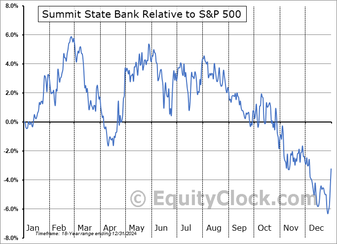 Analysis of the Summit State Bank (NASD:SSBI) seasonal charts above shows that a Buy Date of April 16 and a Sell Date of August 4 has resulted in a geometric average return of 4.65% above the benchmark rate of the S&P 500 Total Return Index over the past 18 years. This seasonal timeframe has shown positive results compared to the benchmark in 14 of those periods. This is a good rate of success and the return strongly outperforms the relative buy-and-hold performance of the stock over the past 18 years by an average of 11.85% per year.