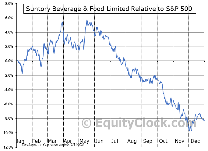 Analysis of the Suntory Beverage & Food Limited (OTCMKT:STBFY) seasonal charts above shows that a Buy Date of March 2 and a Sell Date of May 27 has resulted in a geometric average return of 4.41% above the benchmark rate of the S&P 500 Total Return Index over the past 11 years. This seasonal timeframe has shown positive results compared to the benchmark in 10 of those periods. This is an excellent rate of success and the return strongly outperforms the relative buy-and-hold performance of the stock over the past 11 years by an average of 15.24% per year.
