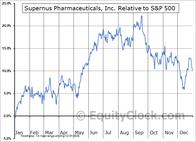 Analysis of the Supernus Pharmaceuticals, Inc. (NASD:SUPN) seasonal charts above shows that a Buy Date of December 13 and a Sell Date of March 7 has resulted in a geometric average return of 6.8% above the benchmark rate of the S&P 500 Total Return Index over the past 12 years. This seasonal timeframe has shown positive results compared to the benchmark in 11 of those periods. This is an excellent rate of success and the return strongly outperforms the relative buy-and-hold performance of the stock over the past 12 years by an average of 6.71% per year.