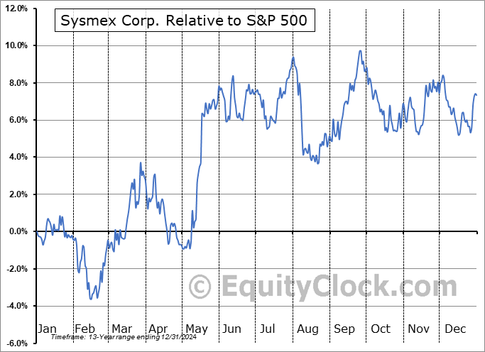Analysis of the Sysmex Corp. (OTCMKT:SSMXY) seasonal charts above shows that a Buy Date of February 24 and a Sell Date of June 29 has resulted in a geometric average return of 7.31% above the benchmark rate of the S&P 500 Total Return Index over the past 13 years. This seasonal timeframe has shown positive results compared to the benchmark in 11 of those periods. This is a very good rate of success and the return strongly outperforms the relative buy-and-hold performance of the stock over the past 13 years by an average of 11.4% per year.