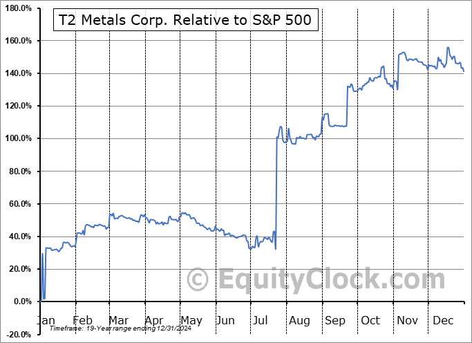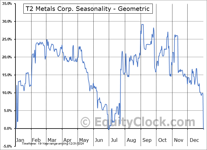 Analysis of the T2 Metals Corp. (OTCMKT:TWOSF) seasonal charts above shows that a Buy Date of July 30 and a Sell Date of October 18 has resulted in a geometric average return of 6.11% above the benchmark rate of the S&P 500 Total Return Index over the past 19 years. This seasonal timeframe has shown positive results compared to the benchmark in 15 of those periods. This is a good rate of success and the return strongly outperforms the relative buy-and-hold performance of the stock over the past 19 years by an average of 15.68% per year.