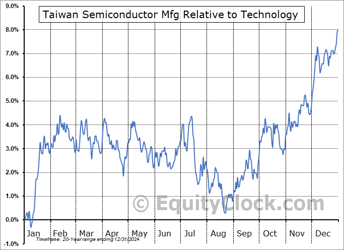 Analysis of the Taiwan Semiconductor Mfg (NYSE:TSM) seasonal charts above shows that a Buy Date of October 24 and a Sell Date of February 6 has resulted in a geometric average return of 9.2% above the benchmark rate of the S&P 500 Total Return Index over the past 20 years. This seasonal timeframe has shown positive results compared to the benchmark in 17 of those periods. This is a very good rate of success, but the return underperforms the relative buy-and-hold performance of the stock over the past 20 years by an average of 0.94% per year.