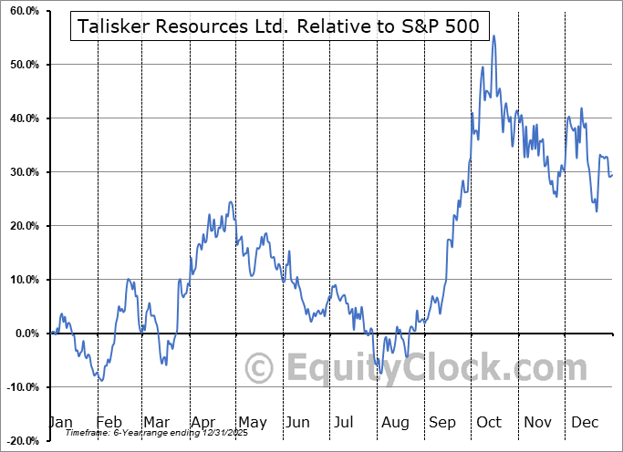 Analysis of the Talisker Resources Ltd. (TSE:TSK.TO) seasonal charts above shows that a Buy Date of February 2 and a Sell Date of April 27 has resulted in a geometric average return of 25.62% above the benchmark rate of the S&P 500 Total Return Index over the past 5 years. This seasonal timeframe has shown positive results compared to the benchmark in 5 of those periods. This is an excellent rate of success and the return strongly outperforms the relative buy-and-hold performance of the stock over the past 5 years by an average of 62.47% per year.