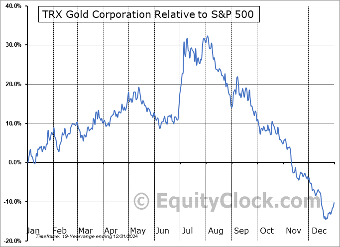 Analysis of the TRX Gold Corporation (AMEX:TRX) seasonal charts above shows that a Buy Date of December 9 and a Sell Date of March 1 has resulted in a geometric average return of 7.34% above the benchmark rate of the S&P 500 Total Return Index over the past 19 years. This seasonal timeframe has shown positive results compared to the benchmark in 13 of those periods. This is a good rate of success and the return strongly outperforms the relative buy-and-hold performance of the stock over the past 19 years by an average of 29.53% per year.