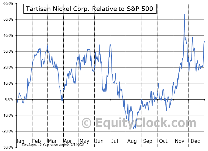 Analysis of the Tartisan Nickel Corp. (CSE:TN.CA) seasonal charts above shows that a Buy Date of October 18 and a Sell Date of February 6 has resulted in a geometric average return of 60.23% above the benchmark rate of the S&P 500 Total Return Index over the past 11 years. This seasonal timeframe has shown positive results compared to the benchmark in 10 of those periods. This is an excellent rate of success and the return strongly outperforms the relative buy-and-hold performance of the stock over the past 11 years by an average of 67.81% per year.