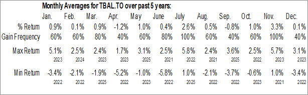 A word of caution: Only 4 years of data is available for shares of TBAL.TO, perhaps insufficient to create a seasonal profile that accurately gauges the seasonal tendencies influencing the investment. Ideally, while 20 years is preferred, at least 10 years of data is required to perform a seasonal analysis that is considered to be reliable for future seasonal periods.
