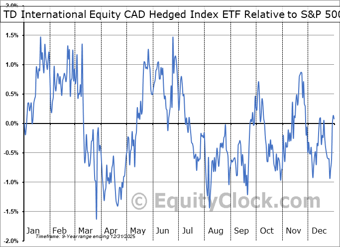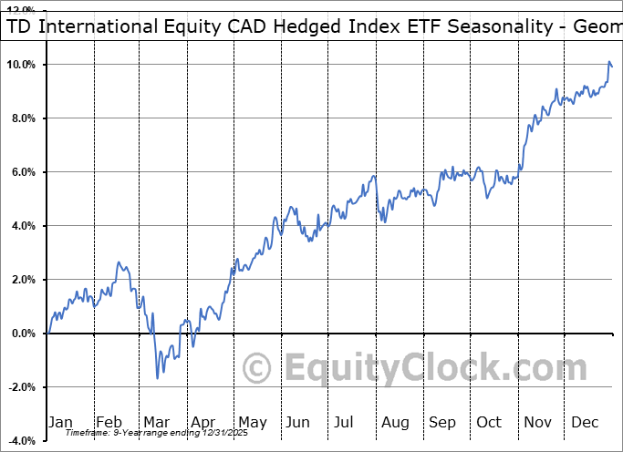 Analysis of the TD International Equity CAD Hedged Index ETF (TSE:THE.TO) seasonal charts above shows that a Buy Date of February 15 and a Sell Date of May 21 has resulted in a geometric average return of 2.36% above the benchmark rate of the S&P 500 Total Return Index over the past 9 years. This seasonal timeframe has shown positive results compared to the benchmark in 8 of those periods. This is a very good rate of success and the return strongly outperforms the relative buy-and-hold performance of the stock over the past 9 years by an average of 6.71% per year.