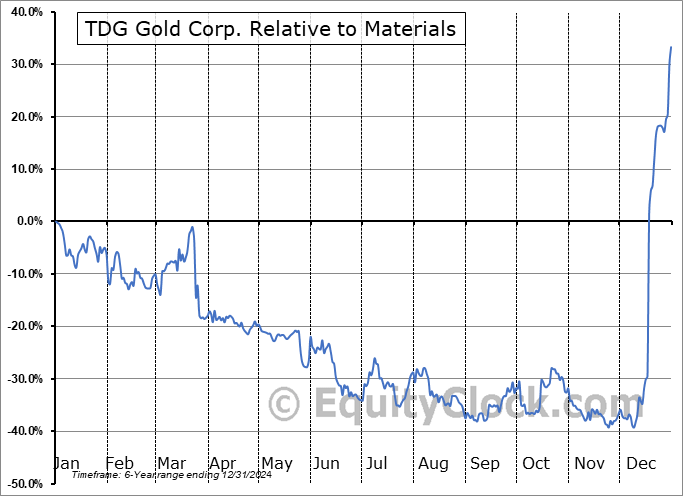 Analysis of the TDG Gold Corp. (TSXV:TDG.V) seasonal charts above shows that a Buy Date of December 3 and a Sell Date of March 10 has resulted in a geometric average return of 42.66% above the benchmark rate of the S&P 500 Total Return Index over the past 6 years. This seasonal timeframe has shown positive results compared to the benchmark in 5 of those periods. This is a very good rate of success and the return strongly outperforms the relative buy-and-hold performance of the stock over the past 6 years by an average of 53.95% per year.