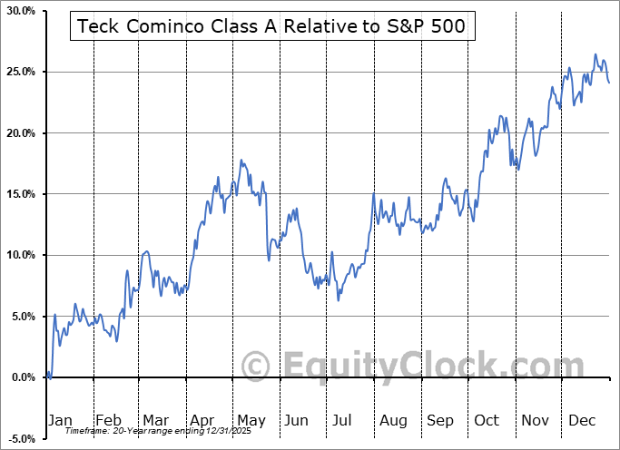 Analysis of the Teck Cominco Class A (TSE:TECK/A.TO) seasonal charts above shows that a Buy Date of November 19 and a Sell Date of February 12 has resulted in a geometric average return of 5.17% above the benchmark rate of the S&P 500 Total Return Index over the past 20 years. This seasonal timeframe has shown positive results compared to the benchmark in 15 of those periods. This is a good rate of success and the return strongly outperforms the relative buy-and-hold performance of the stock over the past 20 years by an average of 7.77% per year.