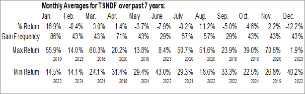 A word of caution: Only 7 years of data is available for shares of TSNDF, perhaps insufficient to create a seasonal profile that accurately gauges the seasonal tendencies influencing the investment. Ideally, while 20 years is preferred, at least 10 years of data is required to perform a seasonal analysis that is considered to be reliable for future seasonal periods.