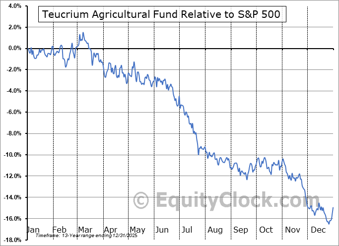 Analysis of the Teucrium Agricultural Fund (AMEX:TAGS) seasonal charts above shows that a Buy Date of December 26 and a Sell Date of March 25 has resulted in a geometric average return of 0.79% above the benchmark rate of the S&P 500 Total Return Index over the past 13 years. This seasonal timeframe has shown positive results compared to the benchmark in 7 of those periods. This is a poor rate of success and the return strongly outperforms the relative buy-and-hold performance of the stock over the past 13 years by an average of 18.36% per year.