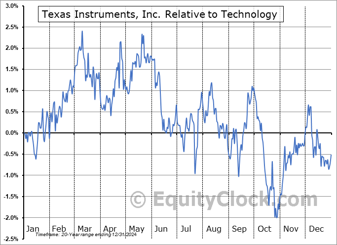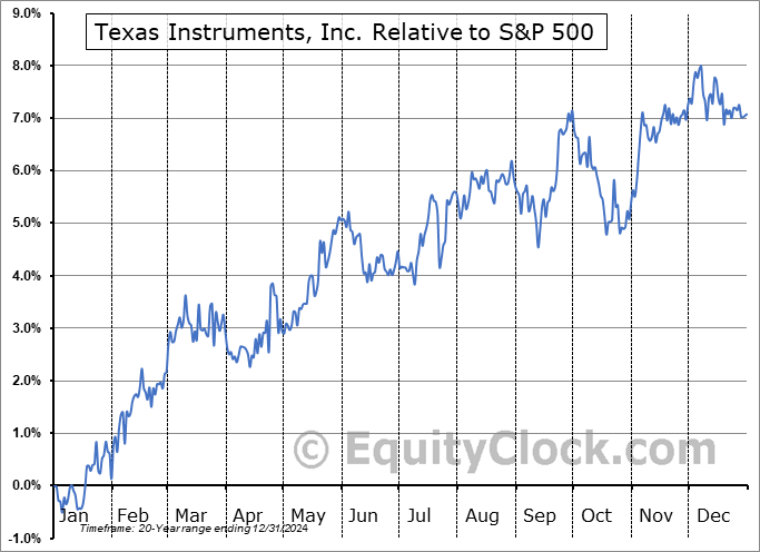 Analysis of the Texas Instruments, Inc. (NASD:TXN) seasonal charts above shows that a Buy Date of November 10 and a Sell Date of March 10 has resulted in a geometric average return of 3.67% above the benchmark rate of the S&P 500 Total Return Index over the past 20 years. This seasonal timeframe has shown positive results compared to the benchmark in 17 of those periods. This is a very good rate of success and the return slightly outperforms the relative buy-and-hold performance of the stock over the past 20 years by an average of 0.72% per year.