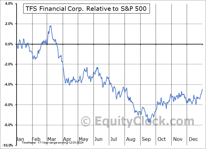 Analysis of the TFS Financial Corp. (NASD:TFSL) seasonal charts above shows that a Buy Date of September 19 and a Sell Date of January 7 has resulted in a geometric average return of 4.31% above the benchmark rate of the S&P 500 Total Return Index over the past 17 years. This seasonal timeframe has shown positive results compared to the benchmark in 11 of those periods. This is a fair rate of success and the return strongly outperforms the relative buy-and-hold performance of the stock over the past 17 years by an average of 10.13% per year.