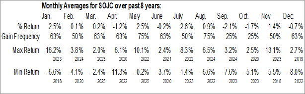 A word of caution: Only 7 years of data is available for shares of SOJC, perhaps insufficient to create a seasonal profile that accurately gauges the seasonal tendencies influencing the investment. Ideally, while 20 years is preferred, at least 10 years of data is required to perform a seasonal analysis that is considered to be reliable for future seasonal periods.