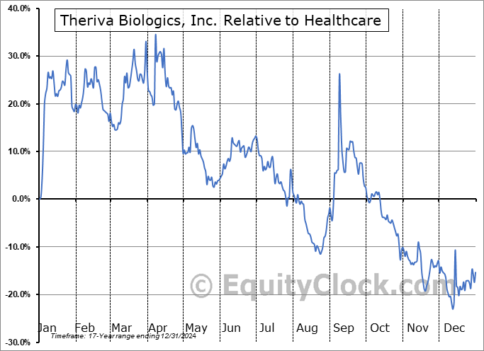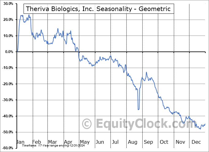 Analysis of the Theriva Biologics, Inc. (AMEX:TOVX) seasonal charts above shows that a Buy Date of December 30 and a Sell Date of March 22 has resulted in a geometric average return of 12.61% above the benchmark rate of the S&P 500 Total Return Index over the past 17 years. This seasonal timeframe has shown positive results compared to the benchmark in 13 of those periods. This is a good rate of success and the return strongly outperforms the relative buy-and-hold performance of the stock over the past 17 years by an average of 112.61% per year.