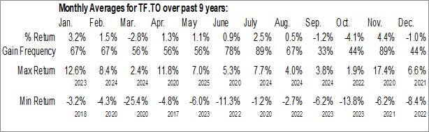 A word of caution: Only 8 years of data is available for shares of TF.TO, perhaps insufficient to create a seasonal profile that accurately gauges the seasonal tendencies influencing the investment. Ideally, while 20 years is preferred, at least 10 years of data is required to perform a seasonal analysis that is considered to be reliable for future seasonal periods.