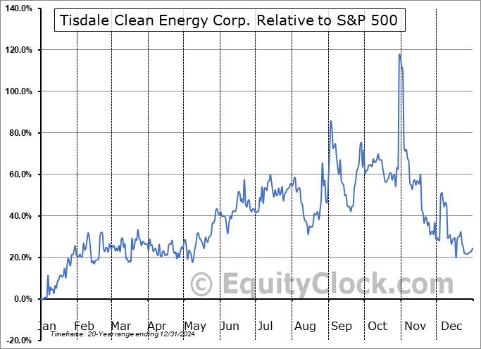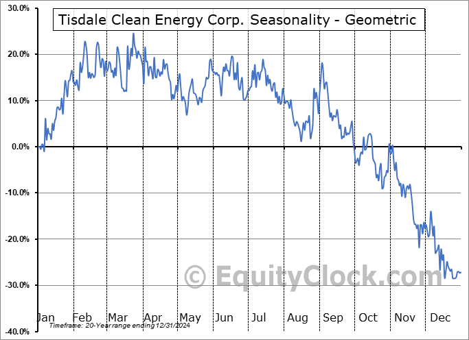 Analysis of the Tisdale Clean Energy Corp. (CSE:TCEC.CA) seasonal charts above shows that a Buy Date of December 17 and a Sell Date of March 25 has resulted in a geometric average return of 21.76% above the benchmark rate of the S&P 500 Total Return Index over the past 20 years. This seasonal timeframe has shown positive results compared to the benchmark in 15 of those periods. This is a good rate of success and the return strongly outperforms the relative buy-and-hold performance of the stock over the past 20 years by an average of 56.44% per year.