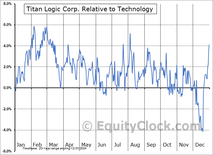 Analysis of the Titan Logic Corp. (TSXV:TLA.V) seasonal charts above shows that a Buy Date of December 8 and a Sell Date of March 1 has resulted in a geometric average return of 8.31% above the benchmark rate of the S&P 500 Total Return Index over the past 20 years. This seasonal timeframe has shown positive results compared to the benchmark in 16 of those periods. This is a very good rate of success and the return strongly outperforms the relative buy-and-hold performance of the stock over the past 20 years by an average of 7.58% per year.