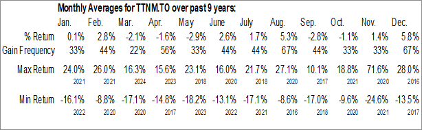 To download TTNM.TO seasonal chart data, please log in or Subscribe.