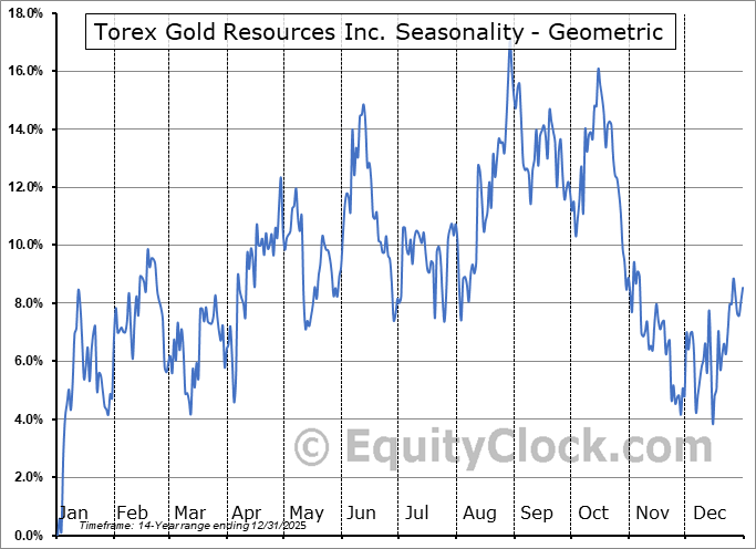 Analysis of the Torex Gold Resources Inc. (OTCMKT:TORXF) seasonal charts above shows that a Buy Date of December 15 and a Sell Date of April 24 has resulted in a geometric average return of 11.55% above the benchmark rate of the S&P 500 Total Return Index over the past 14 years. This seasonal timeframe has shown positive results compared to the benchmark in 10 of those periods. This is a good rate of success and the return strongly outperforms the relative buy-and-hold performance of the stock over the past 14 years by an average of 17.67% per year.