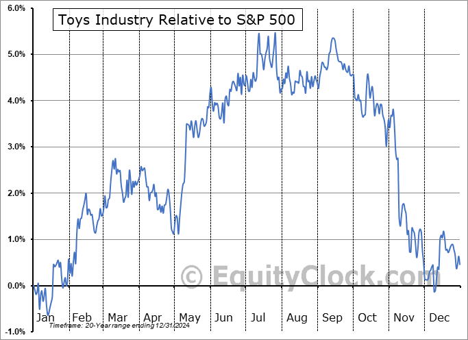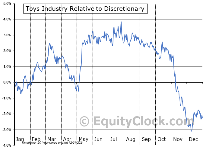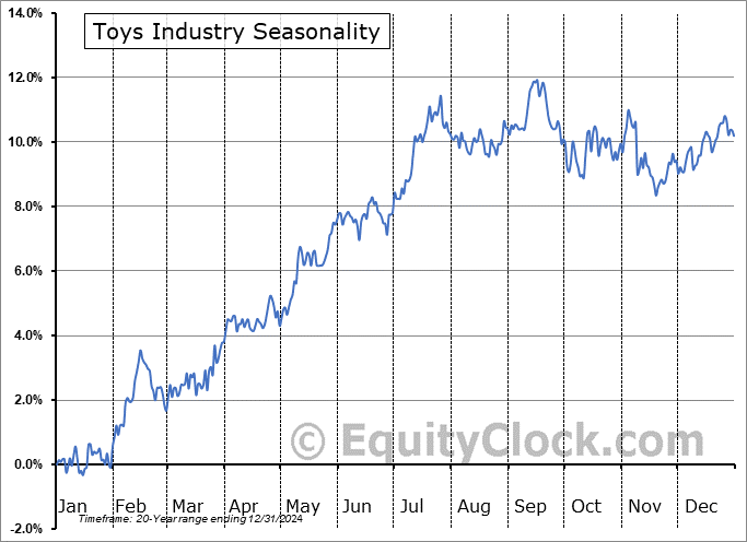 Analysis of the Toys Industry seasonal charts above shows that a Buy Date of May 5 and a Sell Date of July 26 has resulted in a geometric average return of 3.55% above the benchmark rate of the S&P 500 Total Return Index over the past 20 years. This seasonal timeframe has shown positive results compared to the benchmark in 17 of those periods. This is a very good rate of success and the return strongly outperforms the relative buy-and-hold performance of the stock over the past 20 years by an average of 4.65% per year.