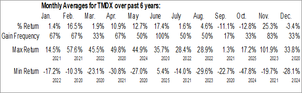 A word of caution: Only 5 years of data is available for shares of TMDX, perhaps insufficient to create a seasonal profile that accurately gauges the seasonal tendencies influencing the investment. Ideally, while 20 years is preferred, at least 10 years of data is required to perform a seasonal analysis that is considered to be reliable for future seasonal periods.