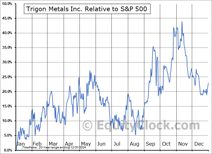 Analysis of the Trigon Metals Inc. (TSXV:TM.V) seasonal charts above shows that a Buy Date of December 6 and a Sell Date of March 7 has resulted in a geometric average return of 11.68% above the benchmark rate of the S&P 500 Total Return Index over the past 20 years. This seasonal timeframe has shown positive results compared to the benchmark in 13 of those periods. This is a good rate of success and the return strongly outperforms the relative buy-and-hold performance of the stock over the past 20 years by an average of 40.89% per year.